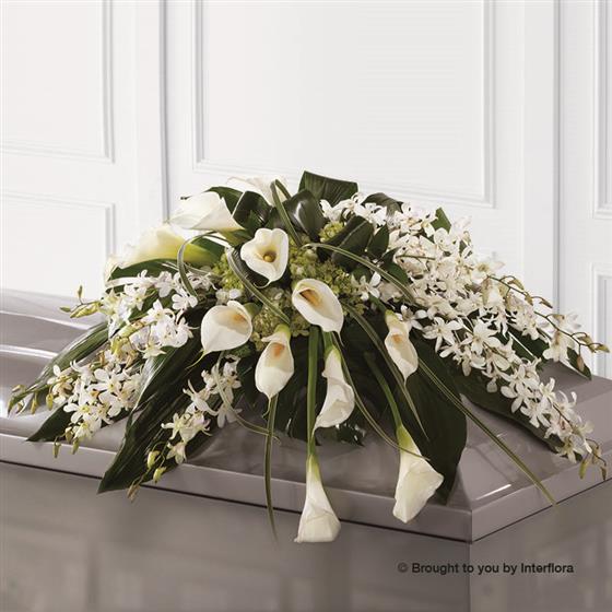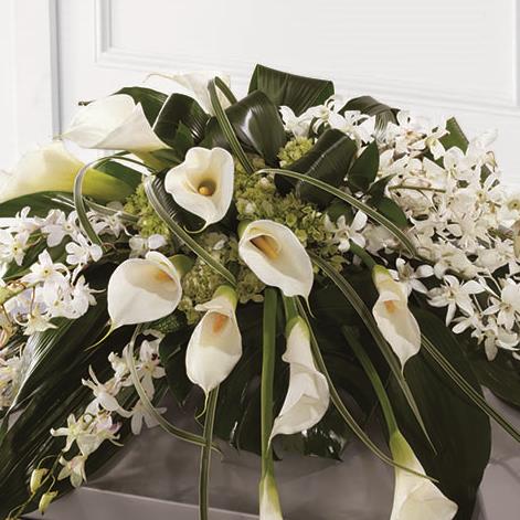 White Dendrobium orchids, white calla Lily, green hydrangea and a variety of lush green leaves are expertly arranged to create a very graceful casket spray.