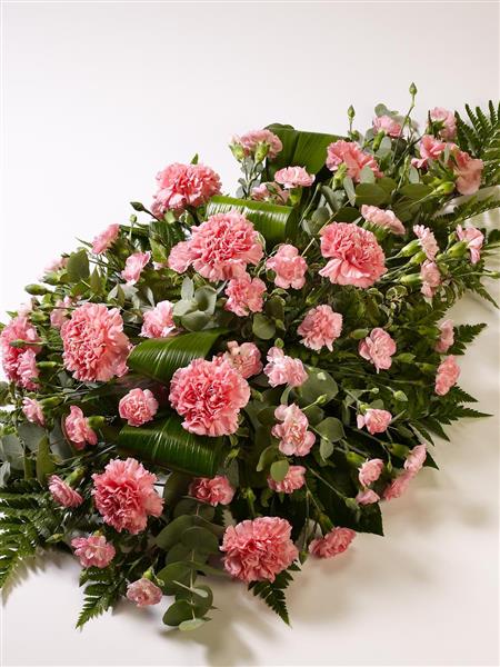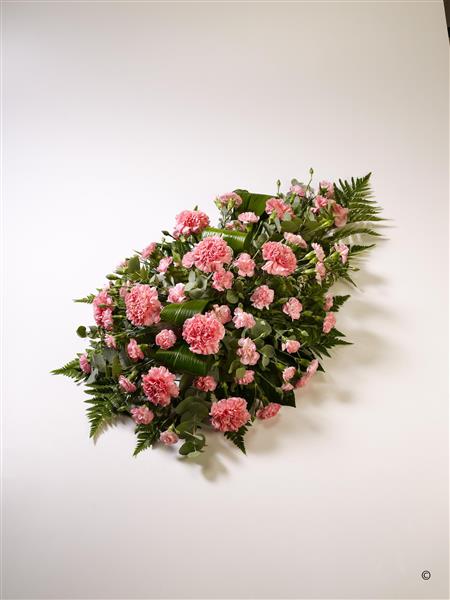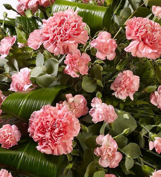 Traditional Floral Spray with Carnations. These fresh Flowers are Carefully Arranged interspersed with Gypsophila, Leather Leaf and Eucalyptus