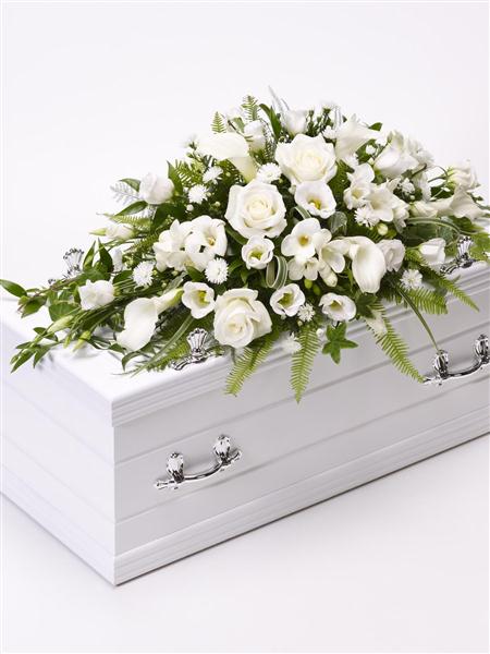 The selection of stunning flowers in snow white shades gives grace and simplicity to this casket spray. The design features calla Lily, sweetly scented freesia, large-headed roses, lisianthus and September flowers, arranged with ruscus, China grass, ferns and ivy trails.