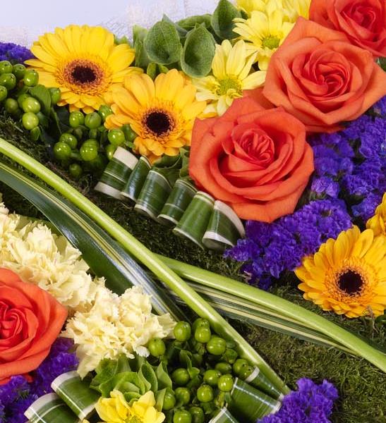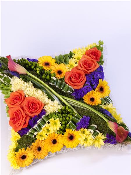 This Striking Contemporary Cushion-Shaped Design Features a selection of Flowers in Vibrant Yellow, Orange, Purple and Pink and Includes Roses, Germini, Carnations, and Statice. The Design is completed with Sweeping Calla Lilies and Veronica