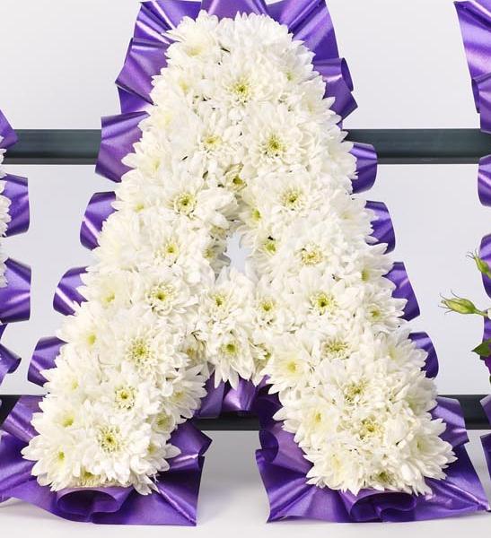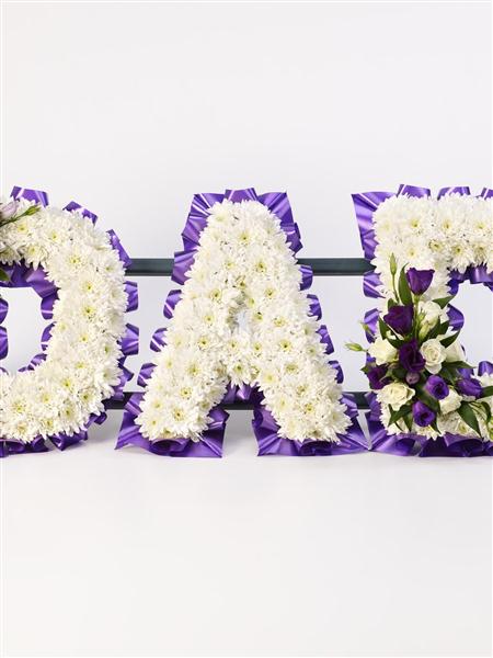 A mass of white double spray chrysanthemums is finished with delicate sprays of roses and lisianthus in white and purple to create this Dad tribute.