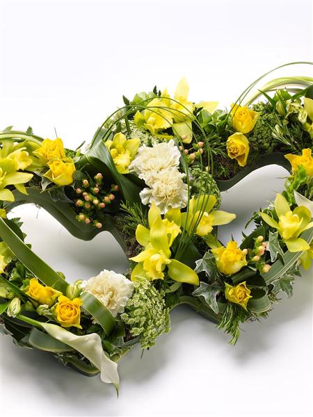 Mini cymbidium orchids, carnations, alstroemeria, short-Stem roses and hypericum in shades of yellow are nestled into two open heart shapes. Loops of steel grass white calla Lily complete this elegant design.