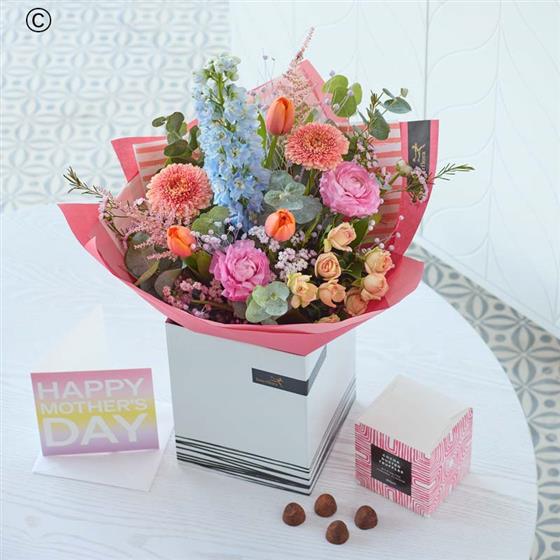 Treat mum to gorgeous blooms plus some lovely extras. She’ll get a gorgeous bouquet handcrafted by a local florist, plus delicious gourmet chocolates and a lovely full-sized card (the florist will pop your message inside). This year our Mother’s Day bouquets are all about gorgeous pastels with pops of colour. Expect to see blooms in shades of baby pink, cream, and lemon with bursts of cerise and tangerine, and highlights of pale blue and lilac.