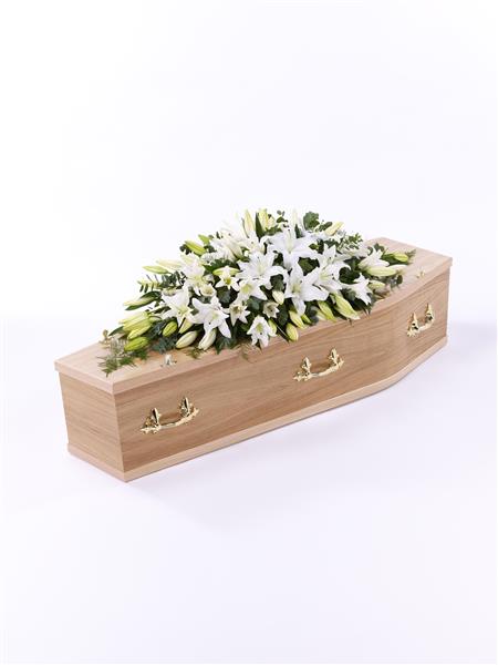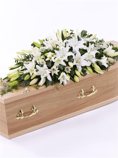 A Blanket of Lilies is Beautifully Complemented by an Array of Luxurious Deep Green Leaves to Create this Casket Spray