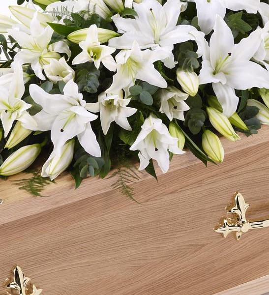 A blanket of white Oriental Lily is beautifully complemented by an array of luxurious deep green leaves to create this simple but striking casket spray. Approximate height 184cm (6ft).