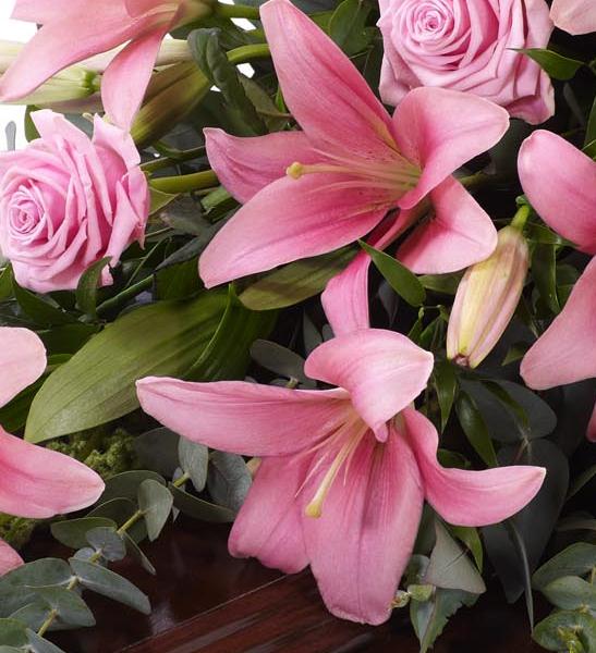 Beautiful Asiatic Lily and large-headed Rose in pretty pink are used to create this elegant casket spray. The fresh flowers are enhanced with trails of green amaranthus as well as ruscus, aralia leaves and eucalyptus. Approximate height 184cm (6ft).