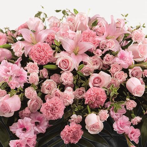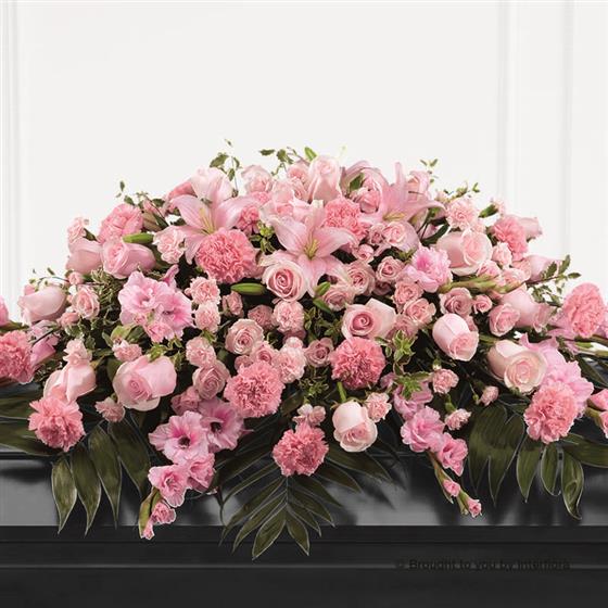 This beautiful casket spray features blushing pink Rose, spray Rose, carnations, gladioli, spray carnations and Asiatic Lily, all elegantly arranged amongst an assortment of lush greens to create a very elegant display.