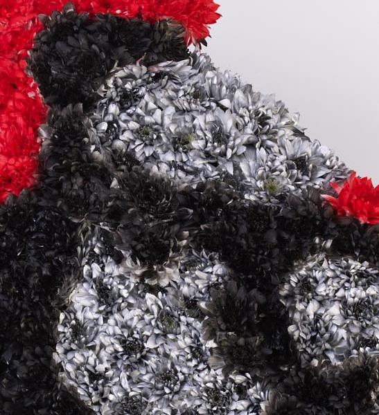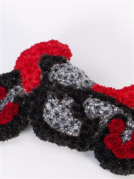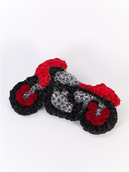 Pay Tribute to their love of Motorcycles with this distinctive Floral Display. The Motorbike is covered in a bed of Fresh Carnations and White Chrysanthemums and Finished in Silver, Red and Black Spray Colours