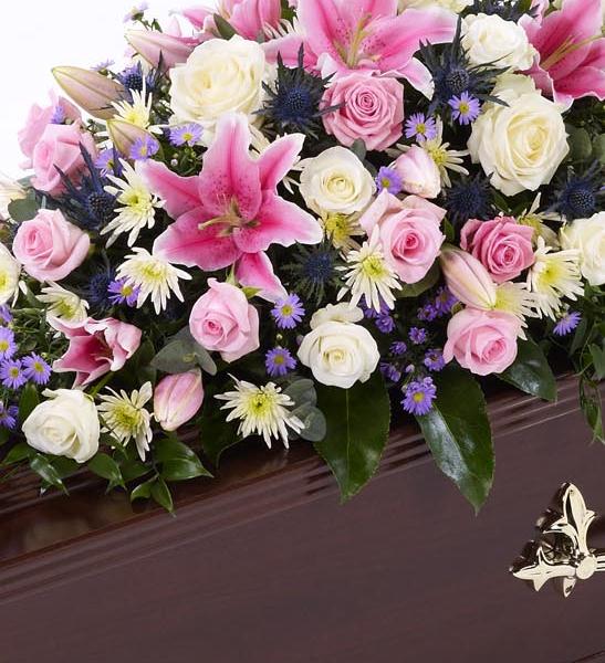 A selection of pink and white Rose are arranged with stunning pink Oriental Lily, blue eryngium, white spray chrysanthemums, lilac September flowers and a selection of foliage to create this beautiful casket spray. Approximate height 153cm (5ft).