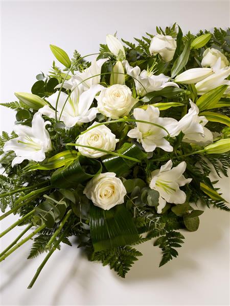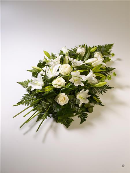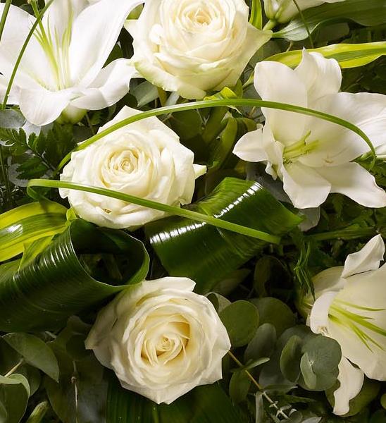 Oriental Lilies and Large headed Roses with Aralia leaves and Ruscus creates this Rose and Lily Spray