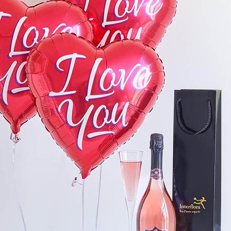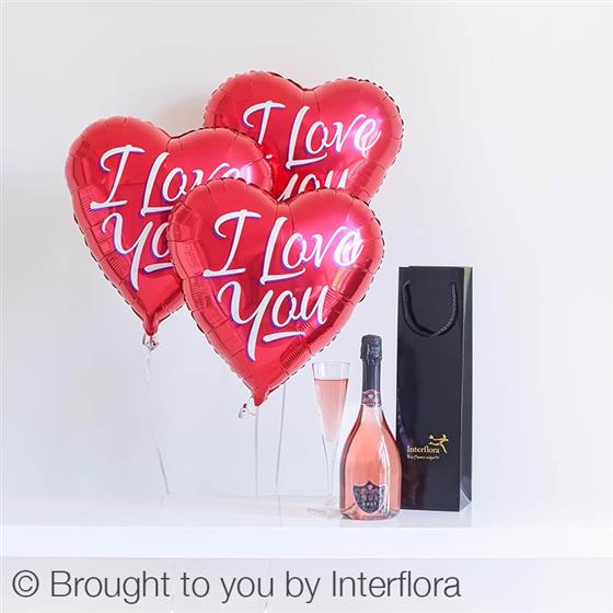 Featuring 3 heart-shaped ‘I love you’ balloons and a bottle of sparkling rose wine presented in an Interflora gift bag.