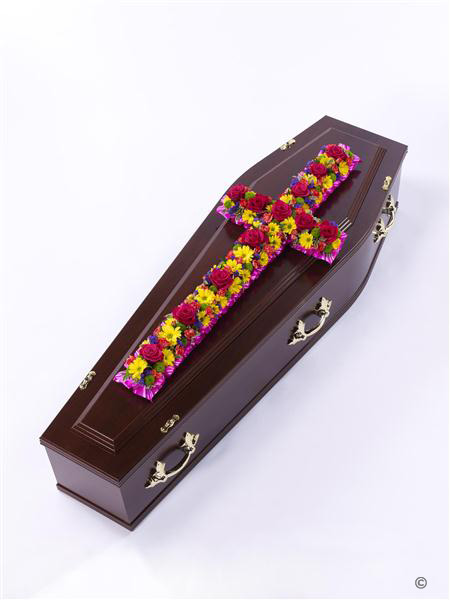 A classic cross covered with a mass of flowers in vibrant shades including roses, spray carnations, spray chrysanthemums and statice. Approximate height 92cm (3ft).