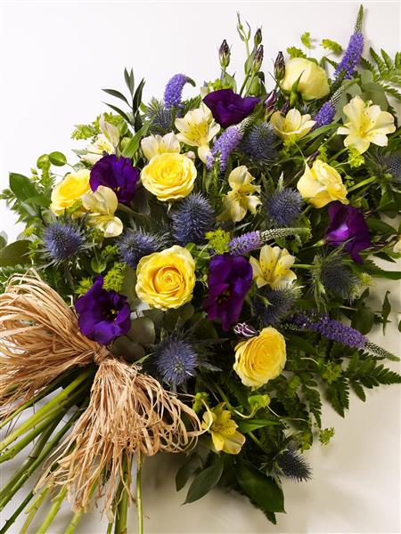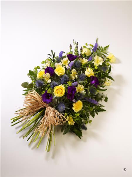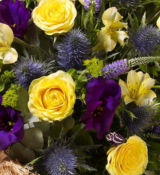Roses, Lisianthus, Alstroemeria and Veronica in shades of pretty pink, purple and Yellow are set off by blue eryngium and Luxury foliage to create this woodland spray